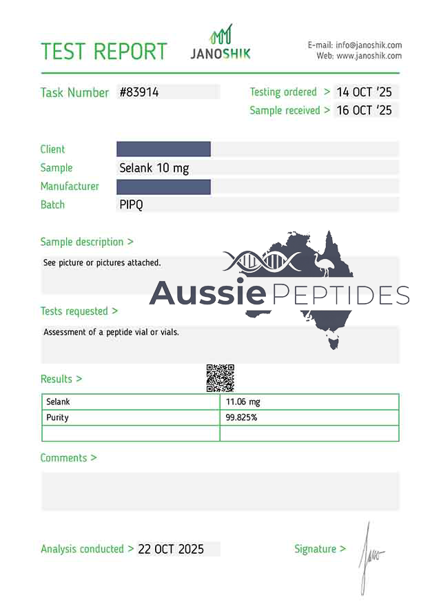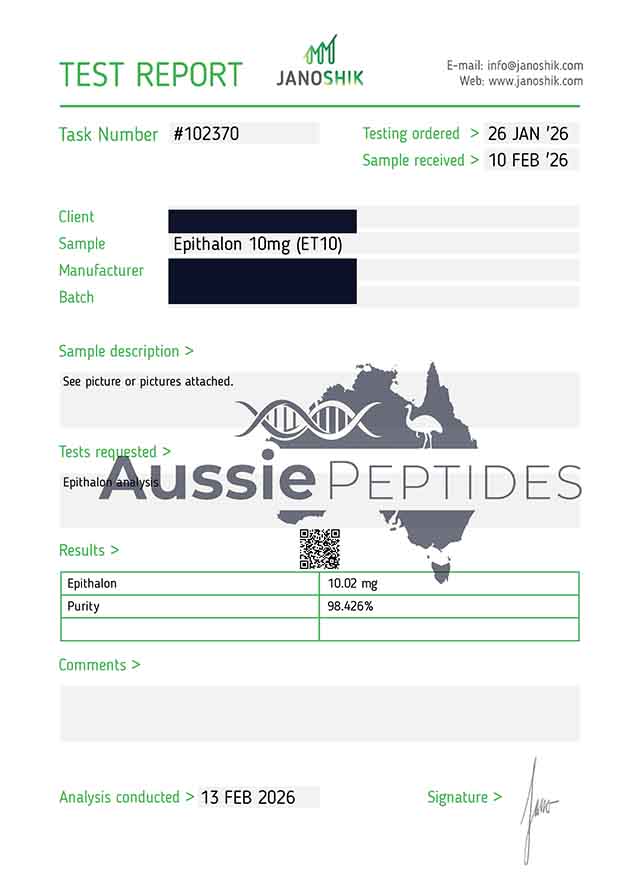 | Epitalon (10mg) | PEP-027-10MG | Anti-Ageing | 98.426% | Available | View CoA |