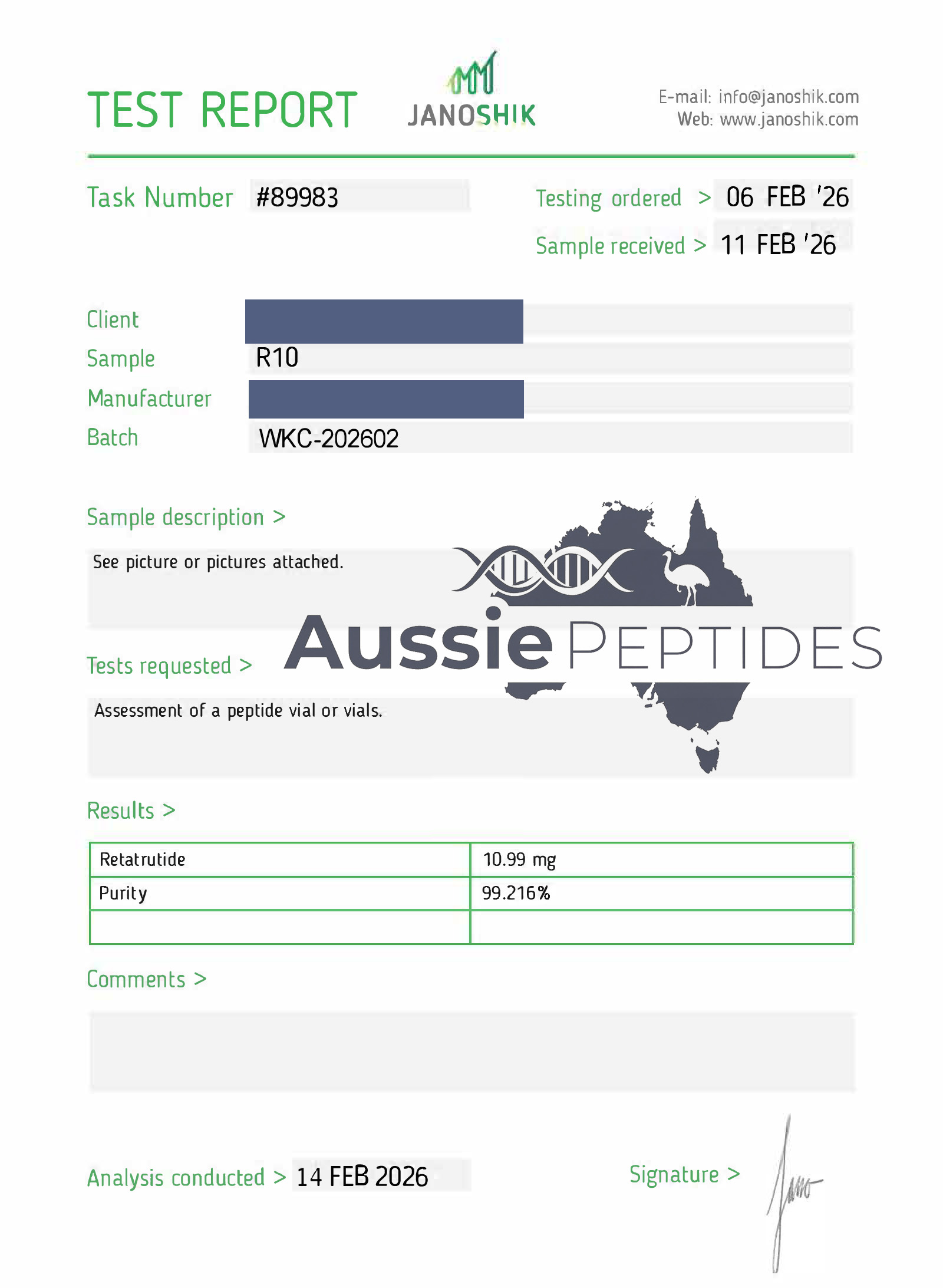 | Retatrutide (10mg) | PEP-007-10MG | Weight Management | 99.216% | Available | View CoA |