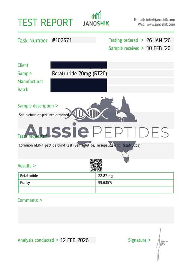 Certificates of Analysis for Retatrutide, Retatrutide 30mg, BPC-157, GLOW, GHK-Cu, KPV, Melanotan II, NAD+, Ipamorelin, Selank, Semax, TB-500, Tirzepatide 20mg, CJC without DAC + Ipamorelin, and BPC-157 + TB-500 are now published below. Testing for remaining products is ongoing and additional CoA documents will be added as they are completed.